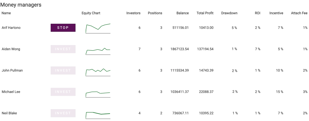 PAMM has a built-in leaderboard of money managers, which provides investors with data about trading performance of money managers.