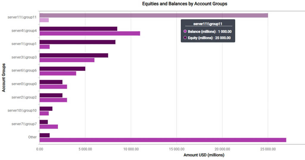 Track your real-time performance with dashboards covering orders from consumers / to providers, books from providers / towards customers, errors, execution latency, profit and loss analytics, client equity and balance metrics, top winners and losers, and additional risk indicators.